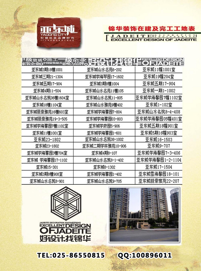 為了更好的讓亞東城的業主了解錦華裝飾的整個工藝流程,錦華裝飾仙林片區分公司整理了所有亞東城的完工及在建工地,歡迎大家來參觀。