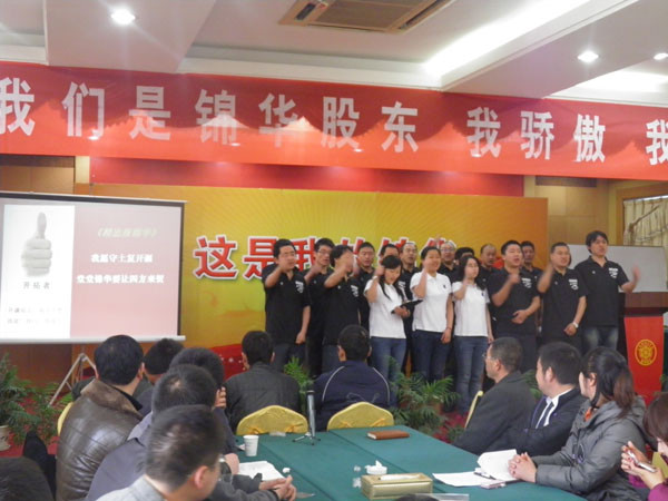 上午一個(gè)重要的環(huán)節(jié)就是——陳述承諾,表達(dá)承諾!所有在場(chǎng)的股東,都用自己的方式,闡述了自己在2011年,作為錦華股東,所作出的承諾——從馬鞍山走回南京、總部23樓爬2個(gè)來(lái)回、喊1000遍敬業(yè)口號(hào)、自罰不菲金額。